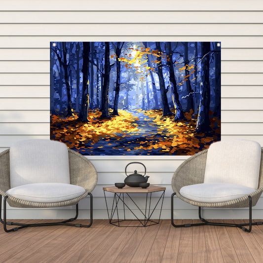 Blauwe en gele planten tegen donkerblauwe achtergrond tuinposter