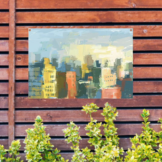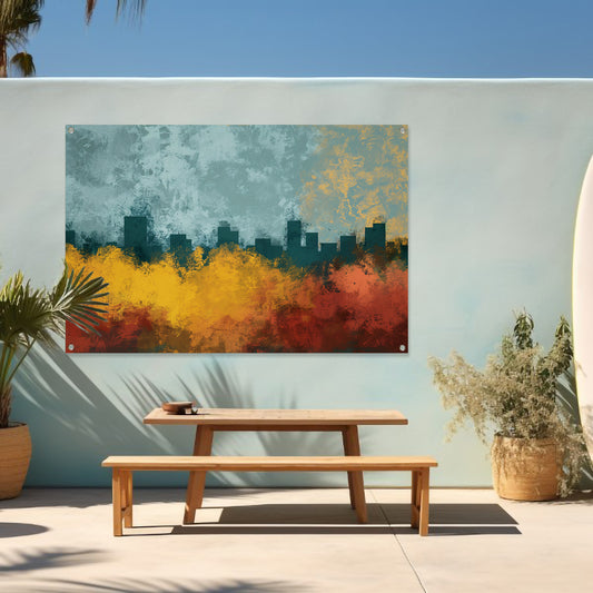 Kleurrijk abstracte skyline schilderij op doek tuinposter