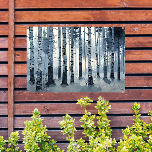 Mystiek berkenbos gehuld in ochtendmist tuinposter