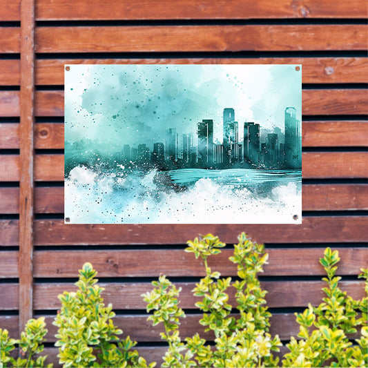 Abstracte skyline in blauwe tinten schilderij tuinposter