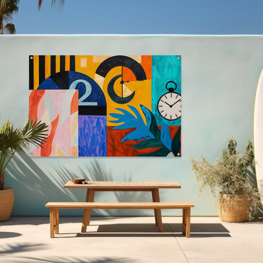 Kleurrijk abstract schilderij met klokken en bladeren tuinposter