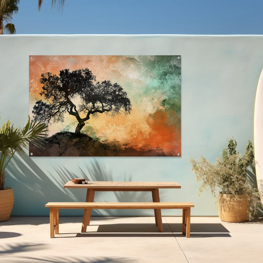 Silhouet van boom met kleurrijke achtergrond tuinposter