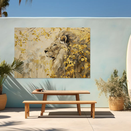 Moderne schilderij van een leeuw en bladeren tuinposter