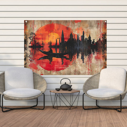 Roeiboot onder Rode Zonsondergang bij Stad tuinposter