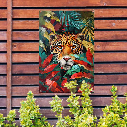 Abstract schilderij van jaguar in kleurrijke jungle tuinposter