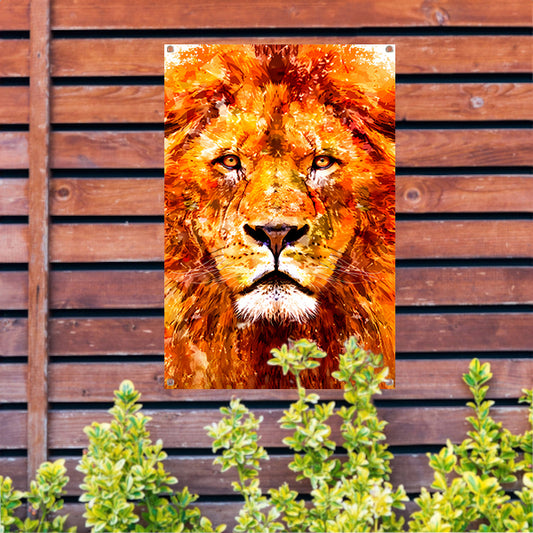 Schilderij van kleurrijke leeuw in close-up tuinposter