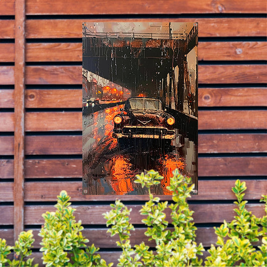 Regenachtige avond met klassieke auto onder brug tuinposter