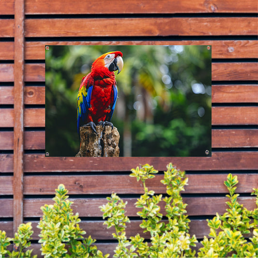 Kleurrijke realistische papegaai op een boomstronk tuinposter