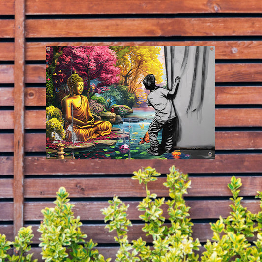 Jongen ontmoet Boeddha in kleurrijk tafereel tuinposter