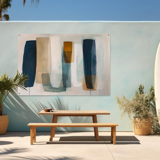 Moderne abstracte kunst in aardetinten en blauw tuinposter