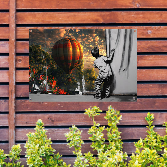 Jongen reikt naar kleurrijke luchtballon tuinposter