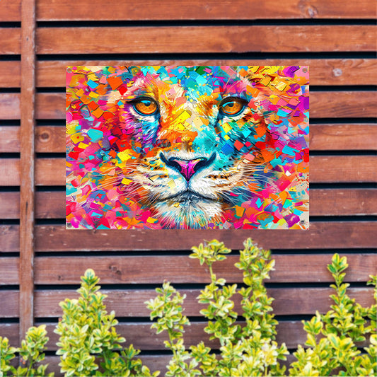 Kleurrijke en surrealistische leeuwenillustratie tuinposter