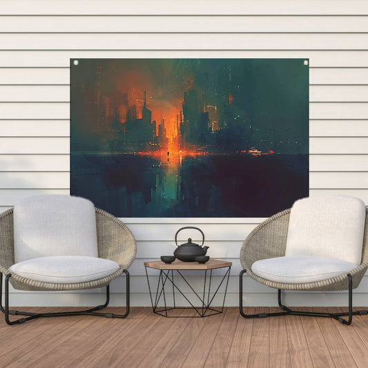 Futuristisch stadsgezicht bij zonsondergang tuinposter