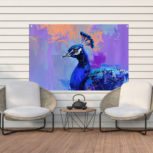 Schilderij van kleurrijke pauw in abstracte stijl tuinposter