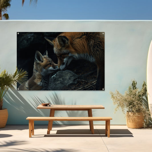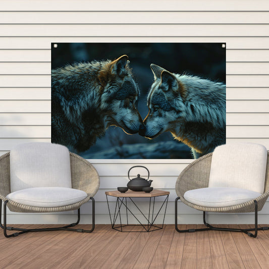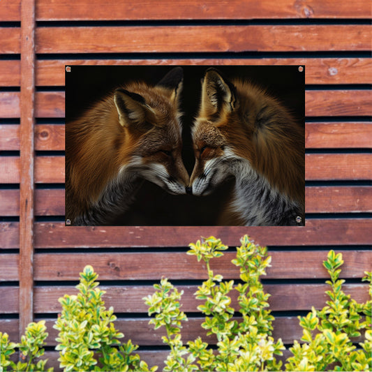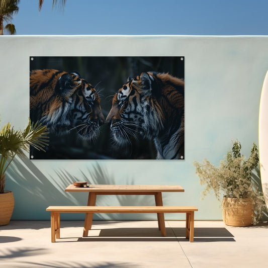 Twee tijgers in donker bos tegenover elkaar tuinposter