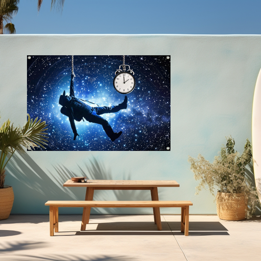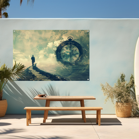 Wandelaar op een surrealistische tijdbrug tuinposter