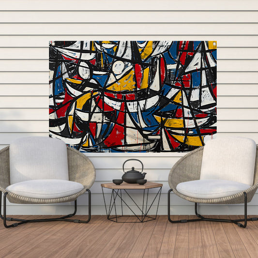 Abstracte dynamische schilderij met kleurrijke boten tuinposter