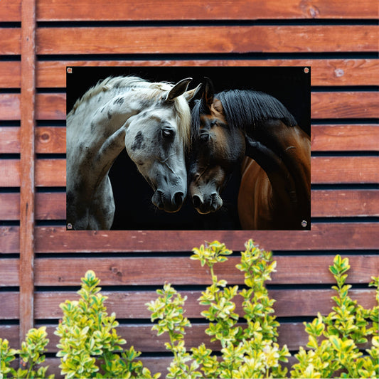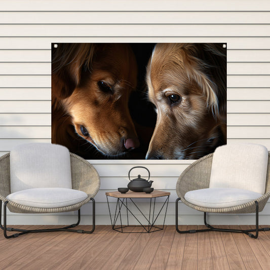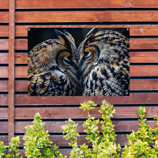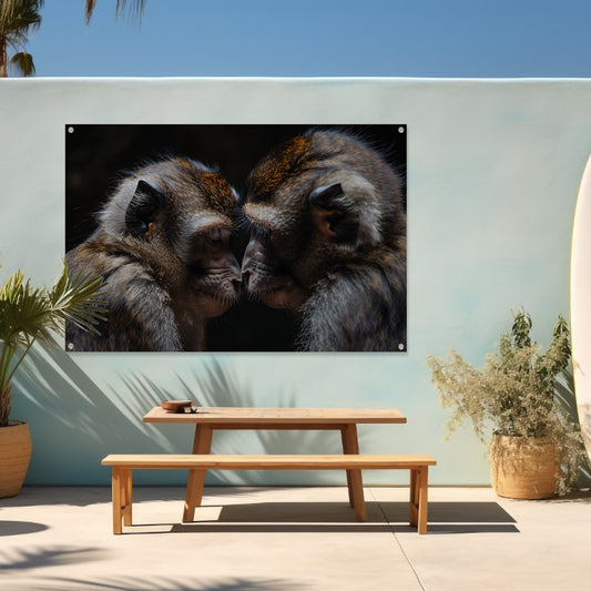 Twee katten in donkere omgeving kijken elkaar aan tuinposter