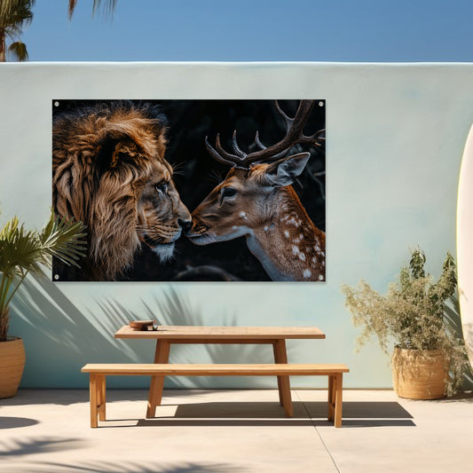 Leeuw en hert tegen donkere achtergrond tuinposter