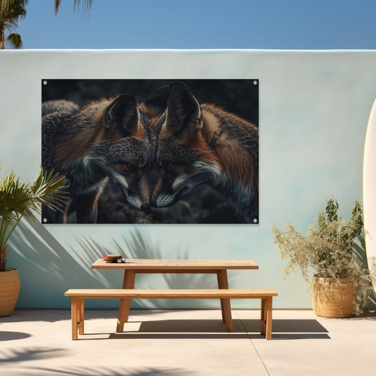 Twee vossen tegenover elkaar in donkere omgeving tuinposter