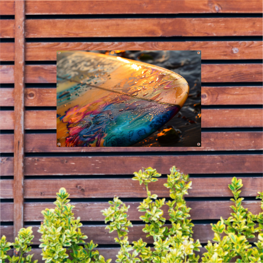 Kleurrijke Surfplank in Glinsterende Zee bij Zonsondergang tuinposter