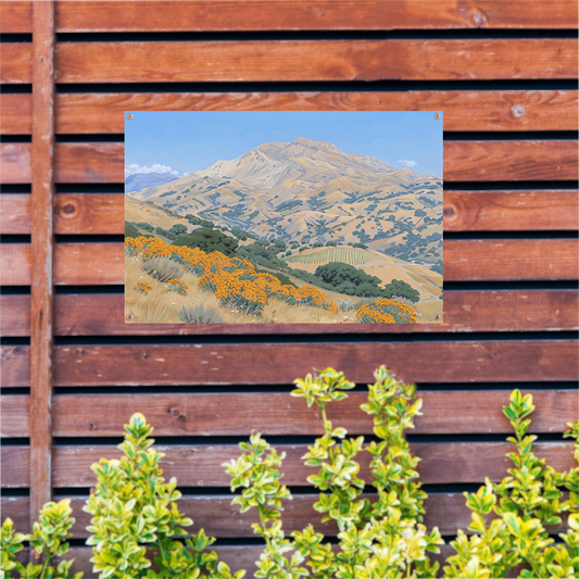 Heuvelachtig landschap met bloemen en berg tuinposter