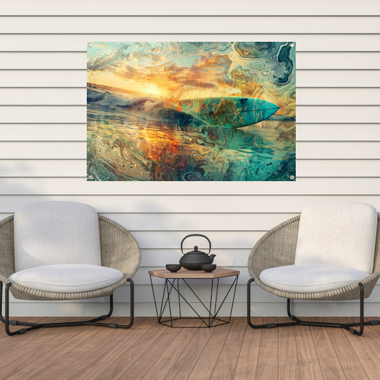 Abstracte Zonsondergang en Surfplank in Zee tuinposter