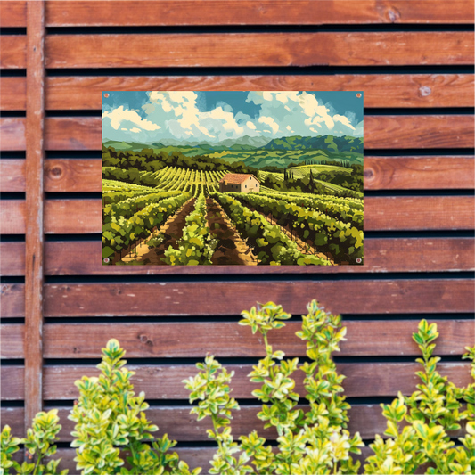 Idyllisch wijngaard landschap met boerderij tuinposter