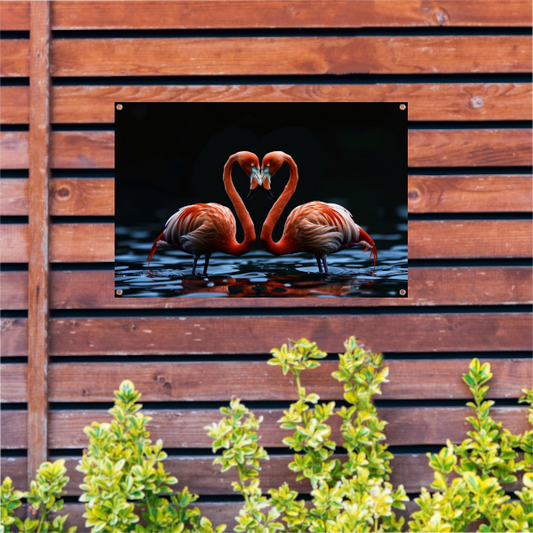 Twee flamingos vormen hart op water tuinposter
