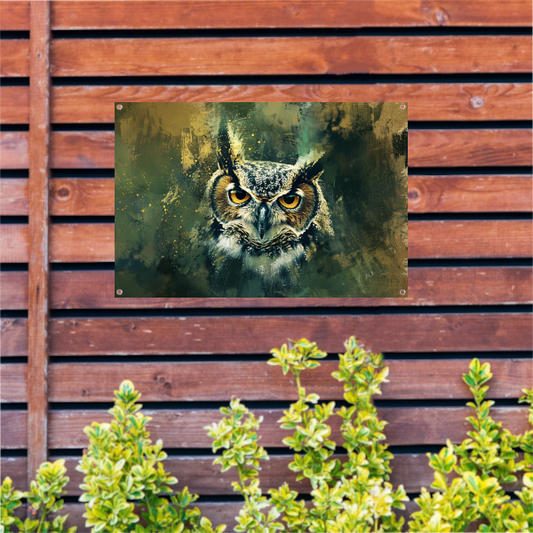 Mysterieuze uil portret in rustieke kleuren tuinposter