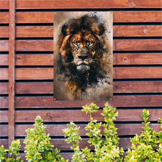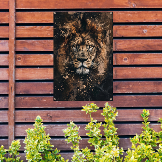 Mysterieus leeuwenportret in rustieke stijl tuinposter