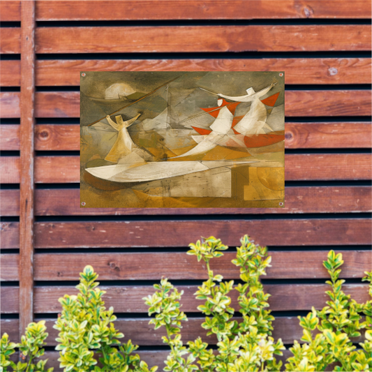 Dynamisch abstract schilderij met kubistische figuren tuinposter