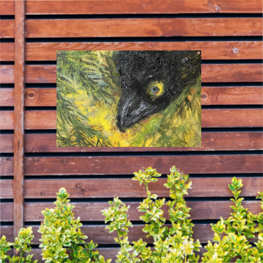 Abstracte vogel in levendige kleuren en bladeren tuinposter