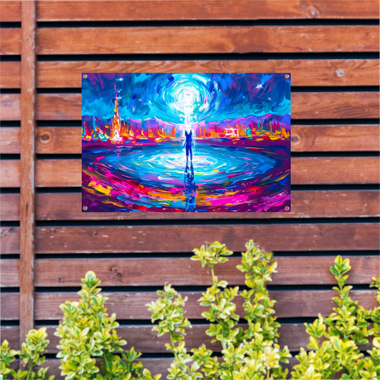 Abstracte kleurenexplosie met mensfiguur tuinposter