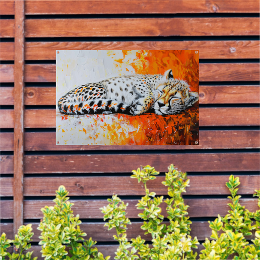 Slapende cheeta met kleurrijke oranje achtergrond tuinposter