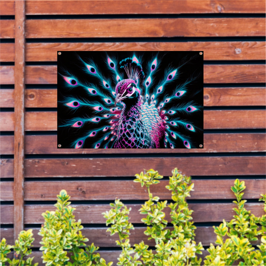 Digitale kunst van een kleurrijke pauw in neon tuinposter