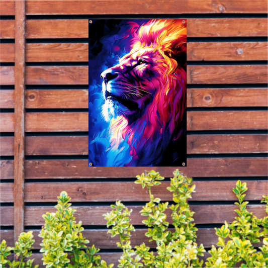 Futuristische bioluminescente leeuw met kleurrijke lichten tuinposter
