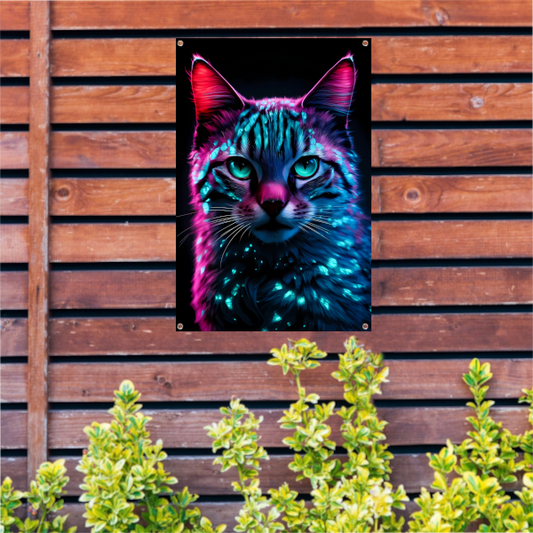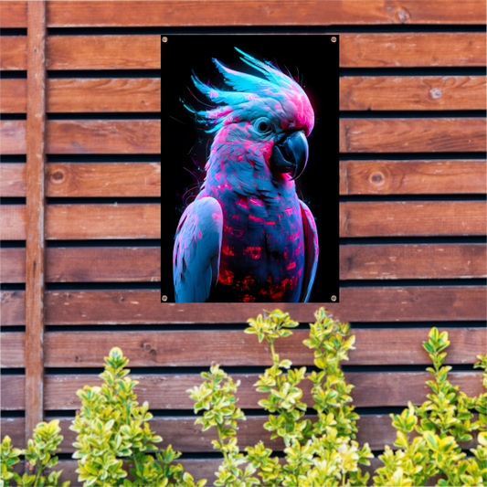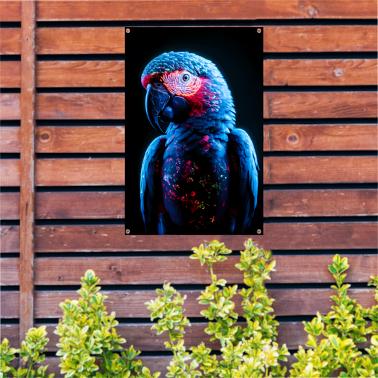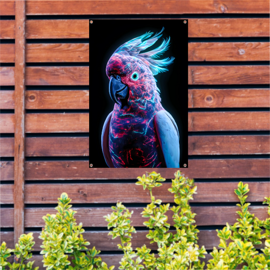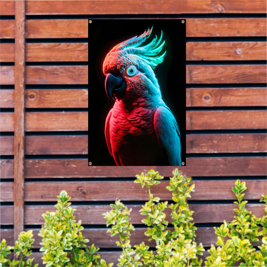 Futuristische neon papegaai in levendige kleuren tuinposter