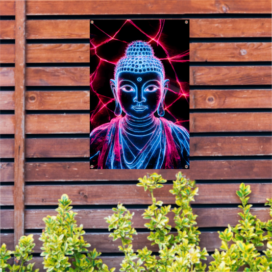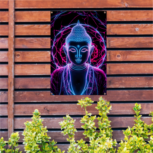 Neon Boeddha met psychedelische kleuren en halo tuinposter
