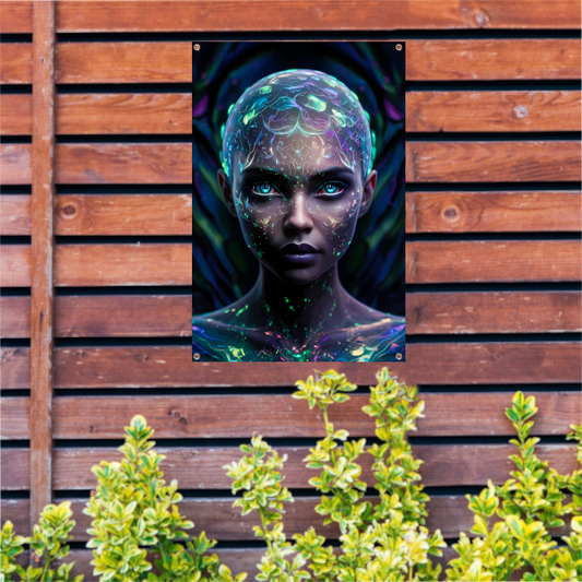 Bioluminiscerende vrouw met futuristische uitstraling tuinposter