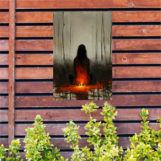 Mysterieus silhouet bij kampvuur in bos tuinposter