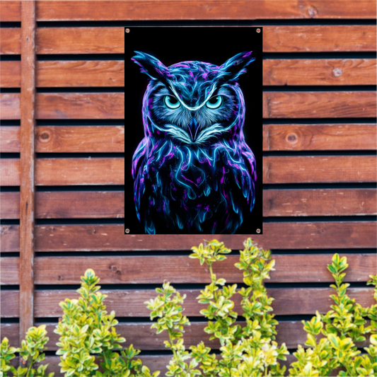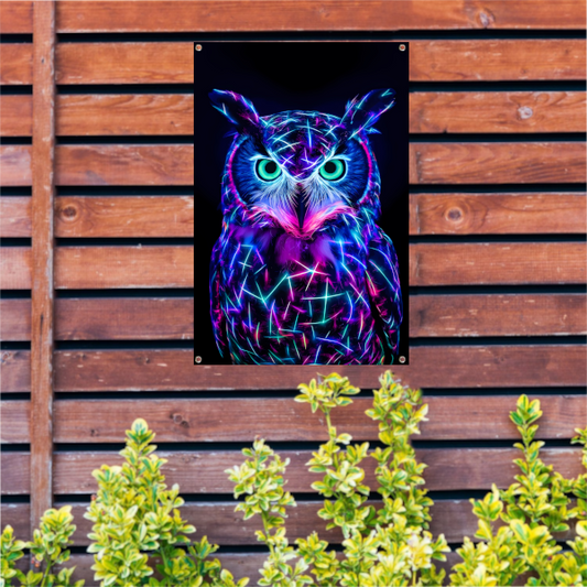 Fluorescerende futuristische uil in levendige kleuren tuinposter