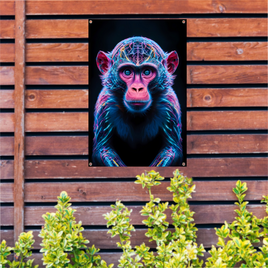 Futuristisch neonportret van een kleurrijke aap tuinposter