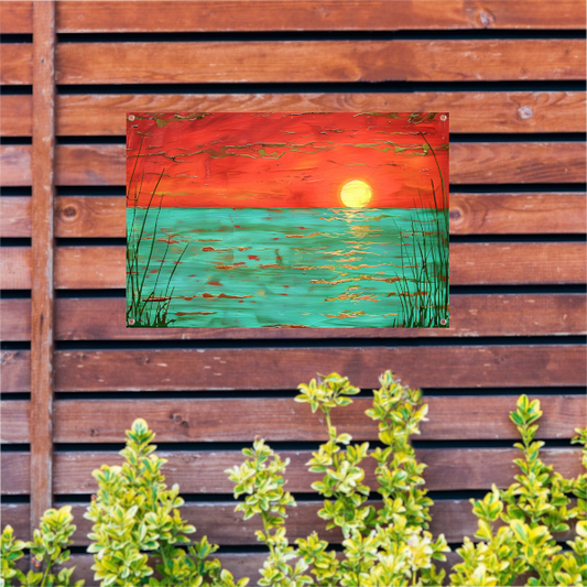 Kleurrijke zonsondergang boven kalm water schilderij tuinposter