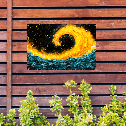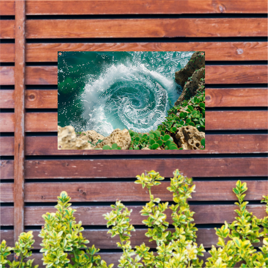 Abstracte waterwerveling bij rotsachtige kust tuinposter