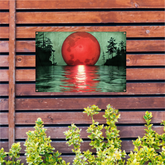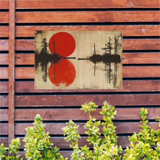Rood-zwarte stadssilhouet bij zonsondergang tuinposter