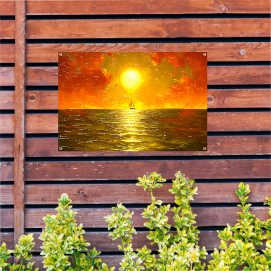 Prachtige zonsondergang met zeilboot op zee tuinposter