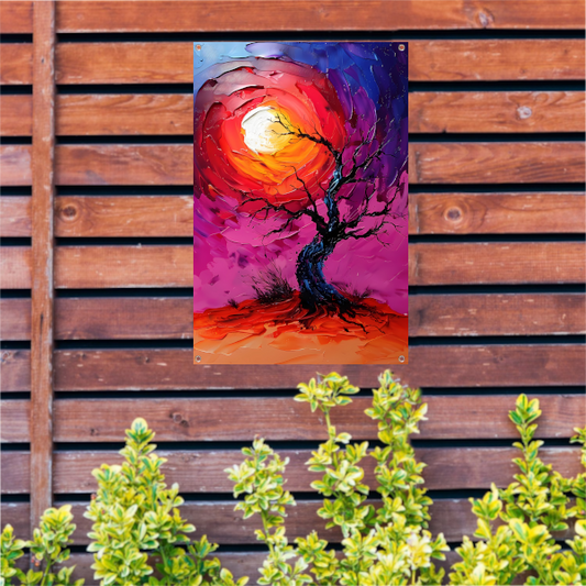 Abstracte kleurrijke boom bij zonsondergang tuinposter