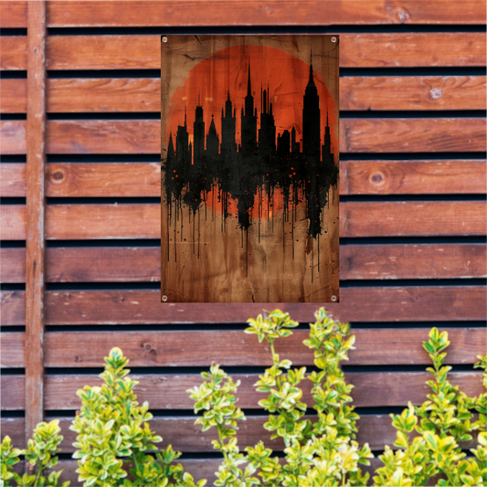 Moderne Abstracte Stadssilhouet met Oranje Zonsondergang tuinposter