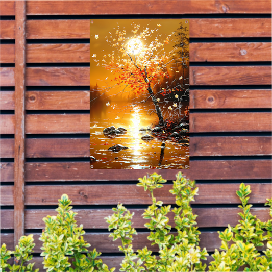 Stralende herfstboom bij zonsondergang met reflectie tuinposter